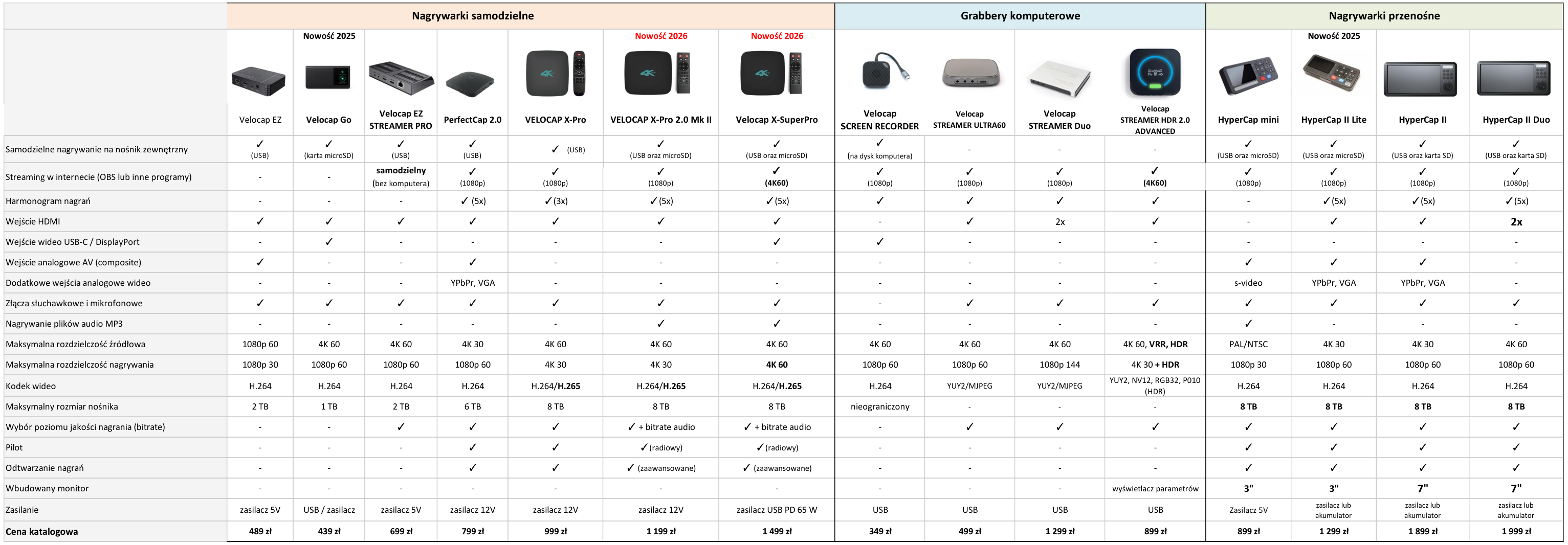 Velocap Go | Velocap EZ | Velocap EZ STREAMER | PerfectCap 2.0 | HyperCap Portable | UltraVideoCap II | Velocap Streamer ULTRA60 | Velocap Streamer ADVANCED | Velocap X | Velocap X Prime | Velocap X-Pro 2.0 | Velocap X-SuperPro | HyperCap mini | HyperCap II Lite | HyperCap II Duo